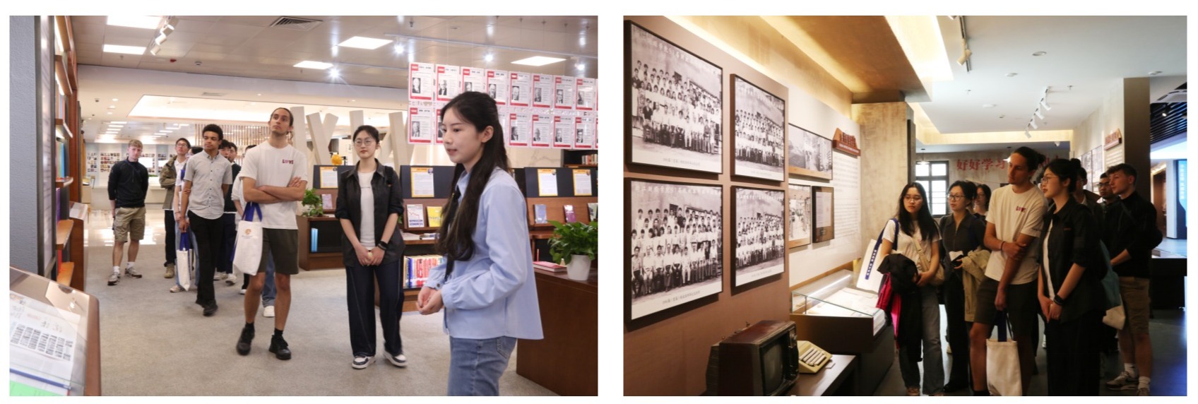 校史馆,与学生代表共同追溯我校五十年办学历程,感受“明德笃学,经邦济世”的精神。随后,师生们参观了我校孙冶方经济科学奖文献馆、诺贝尔经济学奖文献馆,通过珍贵手稿、学术著作及影像资料,深入了解中外经济学领域的研究脉络与前沿成果。剑桥学子尼古拉斯赞叹到:“这些文献不仅是学术珍宝,更是人类文明的共同财富。”