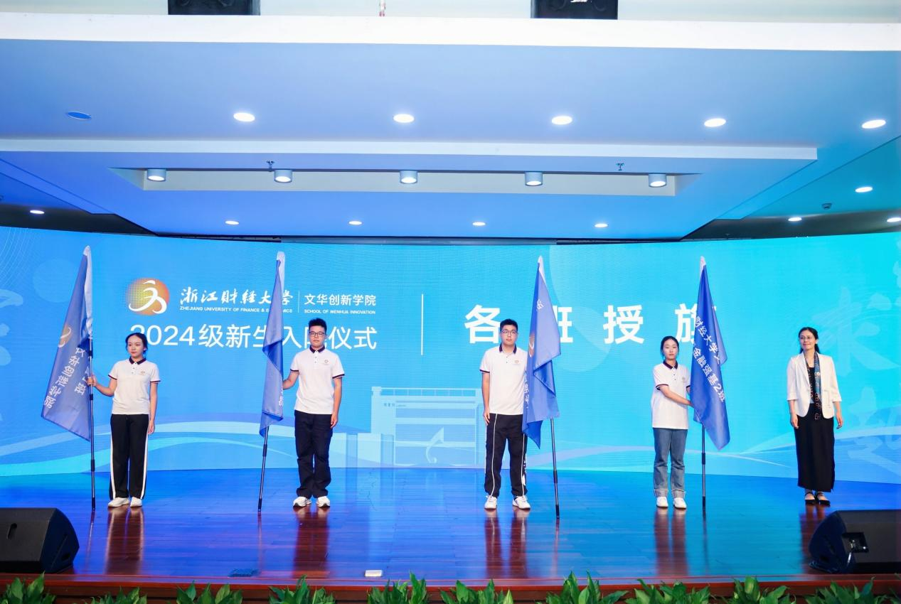 在入院仪式环节,学院负责人为各班授旗。全体新生庄重佩戴上午夜av