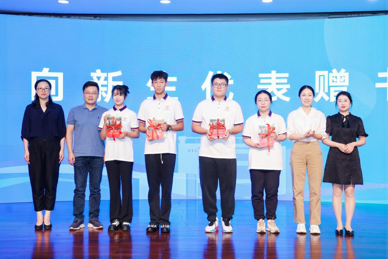 党委宣传部、学工部、团委、教务处相关负责人为新生代表赠书。