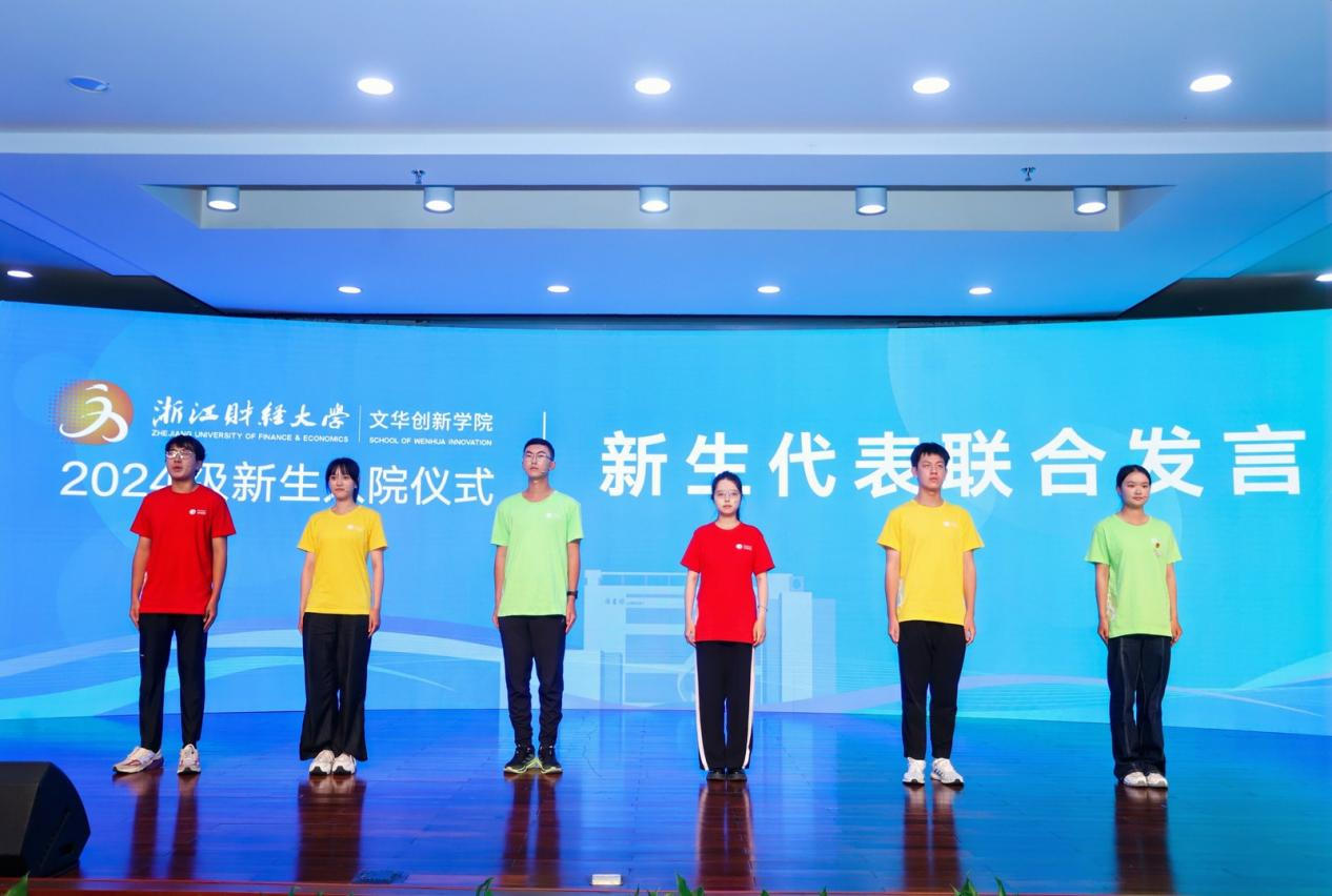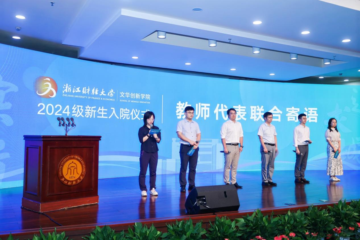 学院2024级新生代表上台发言。他们围绕“过去”与“未来”,表达了对知识的追求与报效祖国的责任感,表示将化挑战为机遇,砥砺奋斗,以百倍的热情和昂扬的斗志,努力成长成为一名MAQ型“完全之人物”的“浙财金生”和“文华金生”。