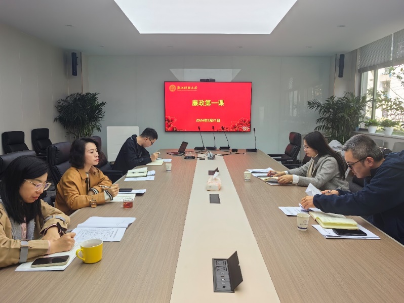 为贯彻落实党的二十大精神,深入学习贯彻习近平总书记关于党的自我革命的重要思想,贯彻落实二十届中央纪委三次全会和省纪委十五届三次全会部署要求,深刻领会高校深化全面从严治党的内涵与意义,深化细化“清廉学院”建设,3月21日,学院党委在浙研院二楼会议室开启2024年党风廉政教育第一课。学院党委书记沈晓敏、纪委书记徐俊、各党支部书记出席会议。