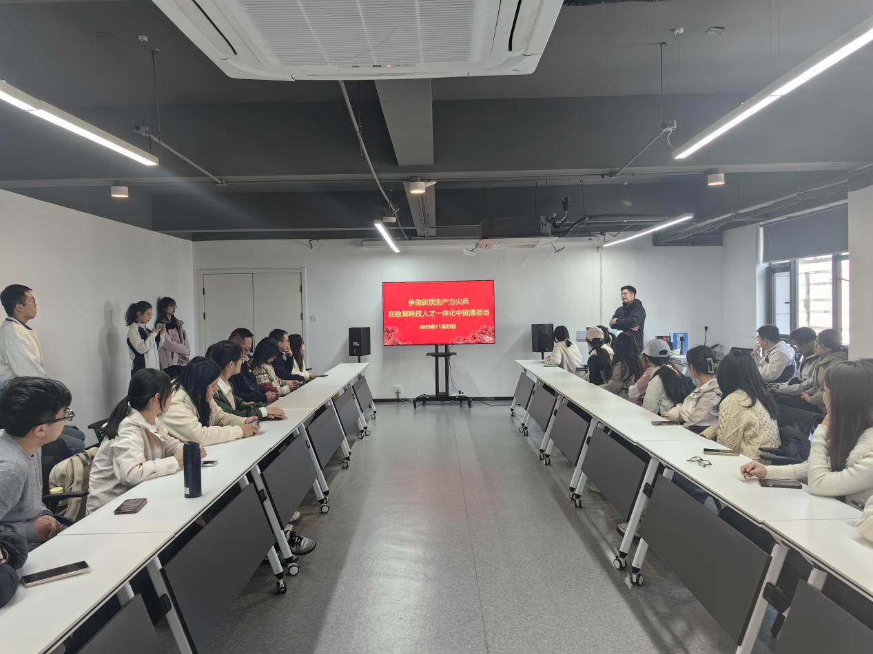 执行院长叶舟带队,组织师生党员代表赴云深处科技、强脑科技两家前沿科技企业开展“红色根脉强基铸魂,数智赋能新质生产”主题党日活动。在云深处科技,企业负责人“争做新质生产力尖兵,在教育科技人才一体化中挺膺担当”的青春宣讲与师生们基于财经视角的犀利提问碰撞出思想火花;在强脑科技,智能仿生手挥毫写下“文研党委”的震撼场景,让脑机接口技术从概念变为可感的创新力量。这场“行走的党课”与“开放的课堂”,不仅深化了师生对教育、科技、人才一体化战略的理解,更激发了将专业所学融入国家科技自立自强的使命担当。与此同时,校内各班级结合实践见闻,广泛开展“青春宣讲”,实现了学习感悟与创新思考的全员分享、全面覆盖。